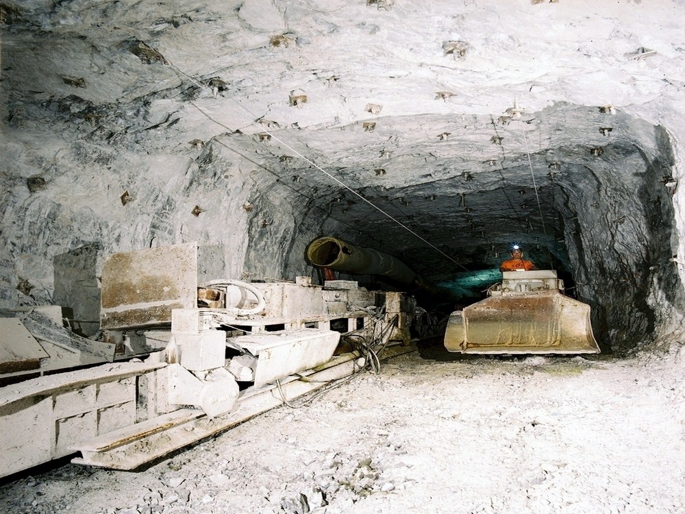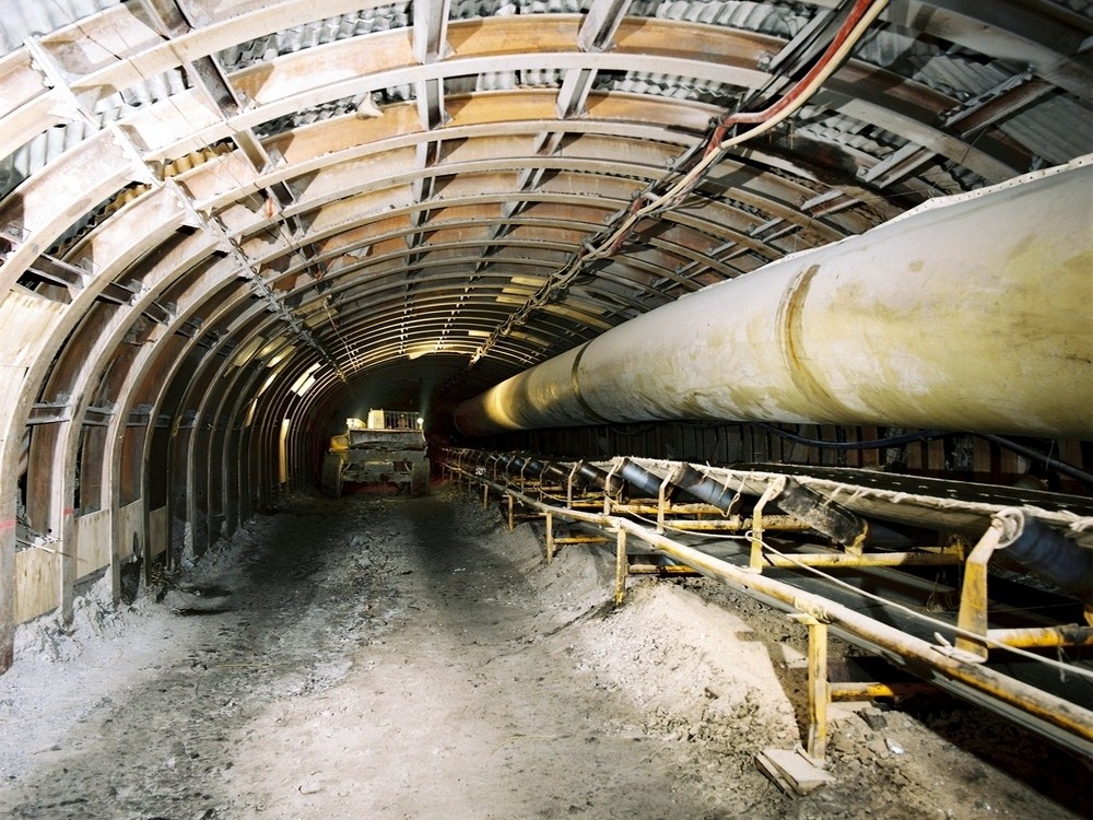 The roadways passed through bands of halite, anhydrite and dolomite deposits. The desired ground support system was by total bolting however this was supplemented by use of steel arched supports in the areas of weaker strata conditions.